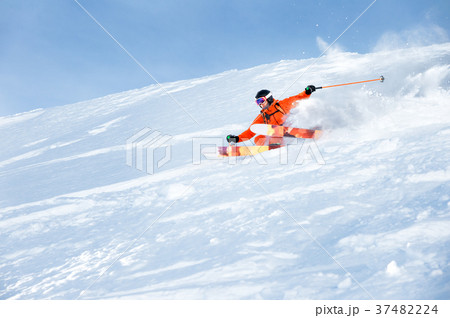 Ski athlete in a fresh snow powder rushes down the