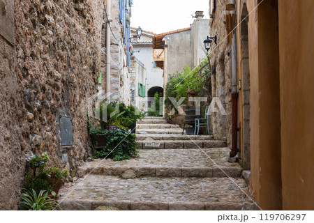 南フランスのサンポールドヴァンス、小さな村の路地の風景
