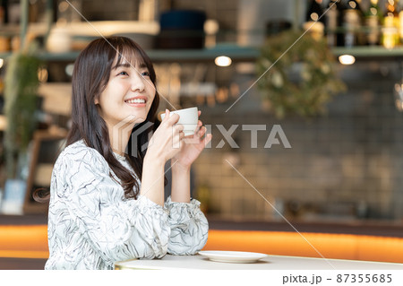 カフェでコーヒーを飲んでいる若い女性