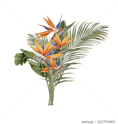 Bright orange strelitzia flowers bouquet floral composition with tropical leaves palm and watercolor illustration on white. Template for textile, fabric, wallpaper, card, packaging, party.