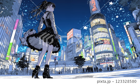 ゴシックロリータファッションで東京の町を歩く若い女性
