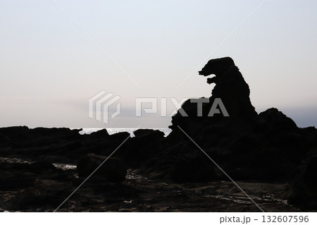 夕焼けに染まる空と海獣の姿をした岩のシルエット