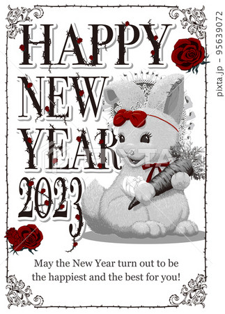 2023年賀状テンプレート「ゴスロリうさぎ」ハッピーニューイヤー 日本語添え書き付