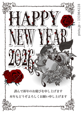 2026年賀状テンプレート「ゴシック調デザイン」ハッピーニューイヤー 英語添え書き付パターン