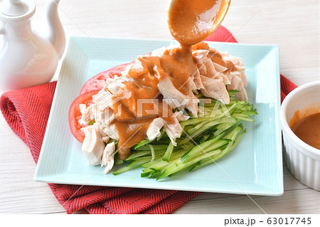 棒棒鶏(バンバンジー)に胡麻ダレをかける