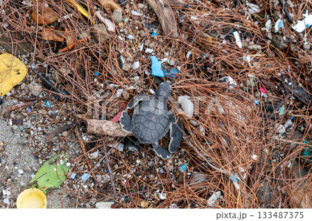 プラスチックゴミの上を歩くアオウミガメの赤ちゃん
