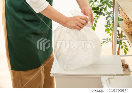 キッチンのゴミ箱にゴミ袋をセットするミドル〜シニア女性の手元