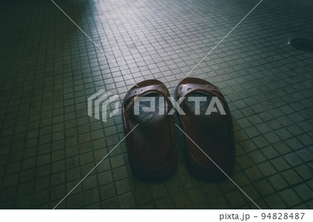 タイル貼りの床に揃えて置かれた便所サンダル - トイレ・便サン・厨房のイメージ素材