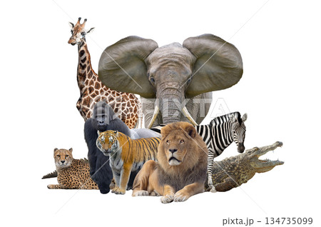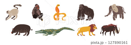 Vector set African animals. Ostrich, flamingo, oryx gazelle, impala, giraffe, crocodile, snake, gorilla, rhino, cheetah, monkey, chimpanzee, lemur, zebra, camel, dromedary, hyena, elephant, lion,