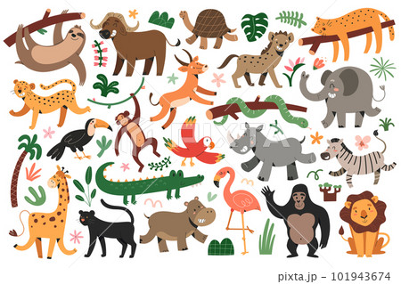 Jungle animals bungle, tropical leopard, felines, dancing giraffe and zebra, sleeping jaguar, set of vector illustrations, cute characters for children