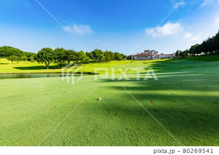 夏の早朝のゴルフ場とクラブハウス