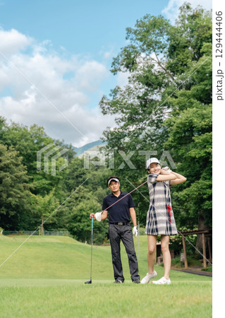 ゴルフ場でゴルフを教えるゴルファーの男性とティーショットを打つ女性ゴルファー