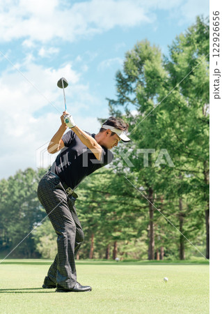 ゴルフ場でゴルフをするゴルファーの男性(ティーショット・ゴルフコンペ)