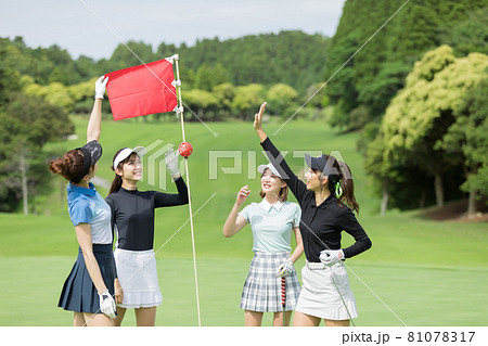 ゴルフ場でハイタッチするゴルフ仲間の女性達