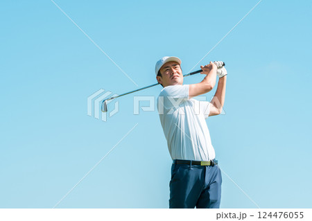 天気のいい青空の中ゴルフを楽しむ男性