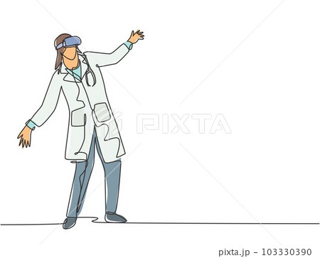 One single line drawing of young happy gamer male doctor playing virtual reality at the office. Smart technology futuristic game player concept. Trendy continuous line drawing graphic vector design
