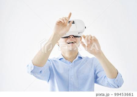 VRゴーグルをかけてバーチャルリアリティを体験する男性 白背景