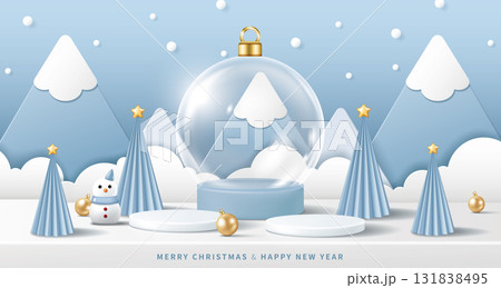 3D可愛雪人、聖誕樹、裝飾球、雪山和商品展示平台,聖誕節藍色橫幅廣告海報宣傳單素材圖片