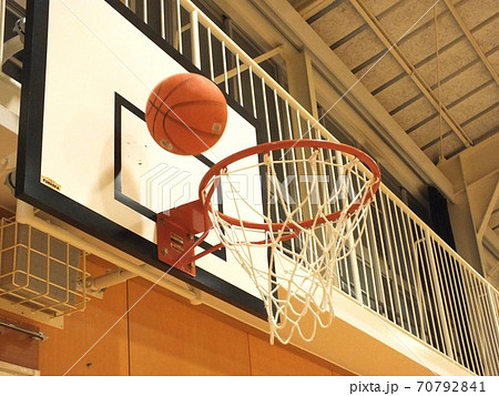 バスケットボールの試合でシュートされたボールがゴールに入る瞬間やゴールネットが揺れる瞬間