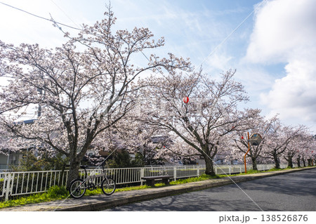桜の下をサイクリングで楽しむイメージ 倉吉市絵下谷川沿い