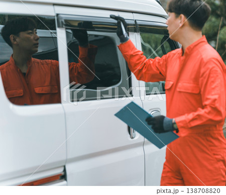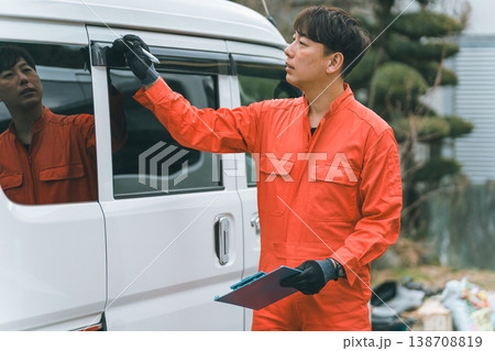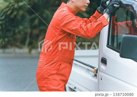 乗用車のサイドウインドーとボディーに夕方の景色が映っている構図