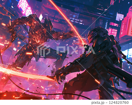 近未来の都市でサイボーグたちがエネルギーブレードで激闘!ネオンの光が反射する迫力満点なアニメスタイル