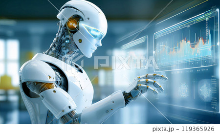 ホログラムスクリーンに向かって働く人間型ロボット AI 人工知能