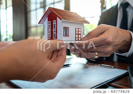 Real estate broker agent presenting and consult to customer to decision making sign insurance form agreement, home model, concerning mortgage loan office