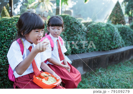 kid primary school student enjoying eating their meal in lunch box