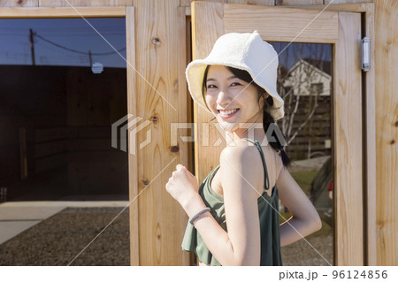 キャンプ場の屋外サウナに入る若い女性 キャビンスタイルサウナ フィンランド式屋外サウナ