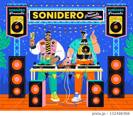 DJ music show with turntables and sound system in hand-drawn flat cartoon style