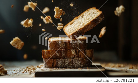 Slices of Wheat Bread Crumbs Flying Dark Background