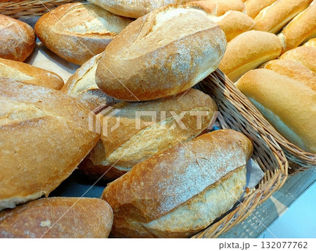Freshly Baked Wheat Bread Loaves in a Rustic Bakery Display During the Morning Hours