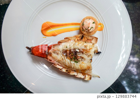 Succulent grilled lobster tail sits elegantly on a white plate, accompanied by a rich sauce and a dollop of seafood mousse. Perfect presentation for seafood lovers.