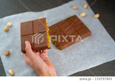Trend Dubai chocolate with pistachio paste and kataifi dough in woman hands. Confectionery handmade sweets at home in the kitchen.
