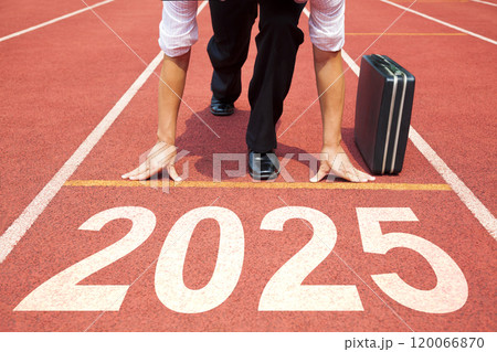 Happy new year 2025 concept. Business Man preparing to run on athletics track engraved with the year 2025. Getting ready for the new year