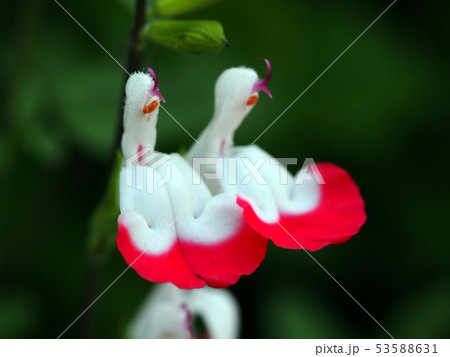 紅白のホットリップスの花(花とつぼみをつけたチェリーセージの枝)