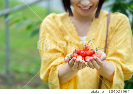 サクランボ狩りをする女性 果物狩りをする女性