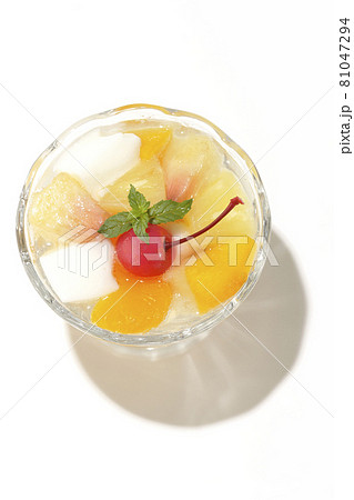 牛乳かんやパイン、マンゴー、白桃、チェリー、ミカン等のフルーツが入ったフルーツポンチを白背景で撮影