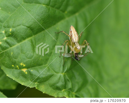 巣を作らないクモ。葉陰で獲物を待ち伏せするササグモの雌