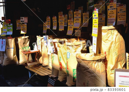 さまざまな銘柄米の袋が並ぶ米穀店の店頭
