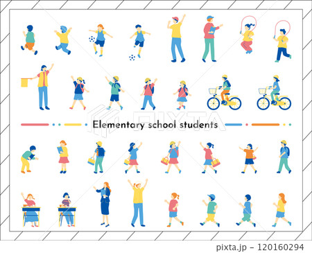 元気に歩くグローバルな大勢の小学生たち セットのストックイラスト素材