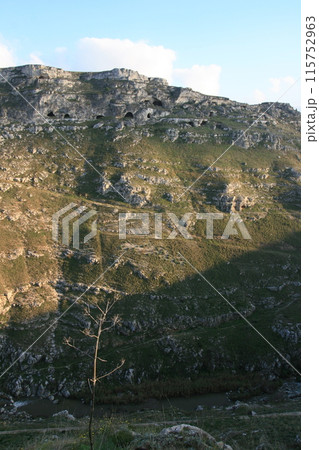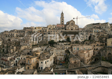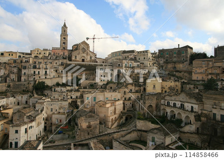 南イタリアマテーラの洞窟住居と青空と白い雲