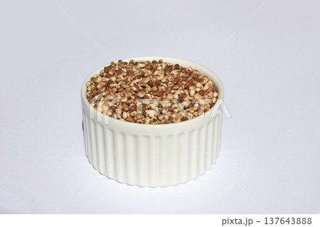 Sorghum seeds in ceramic bowl and wooden scoop isolated on white background with full depth of field.