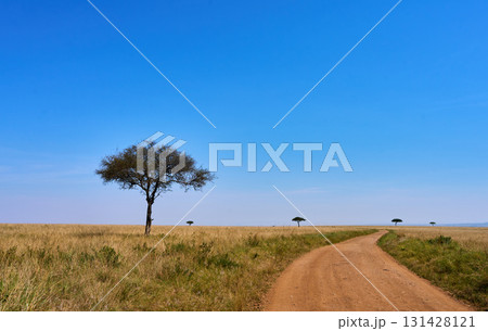 マサイマラのサバンナを横切る赤土の道と孤立した木