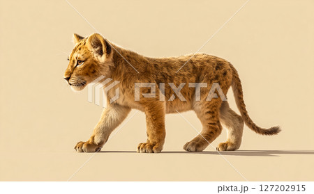 遊ぶライオンの子が歩く途中の姿、リアルな野生動物写真