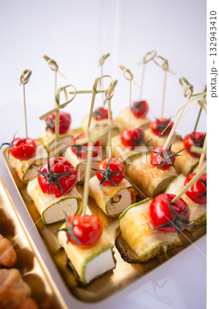 Elegant zucchini rolls with cheese and cherry tomatoes on golden serving tray