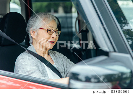 自動車の運転をする笑顔の高齢者ドライバーの女性