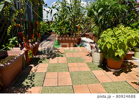 夏のルーフバルコニー タイルを敷いて、プランターで野菜づくり 自給自足・節約