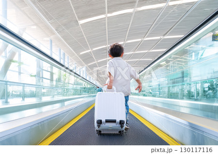 スーツケースをを引いて歩く男の子